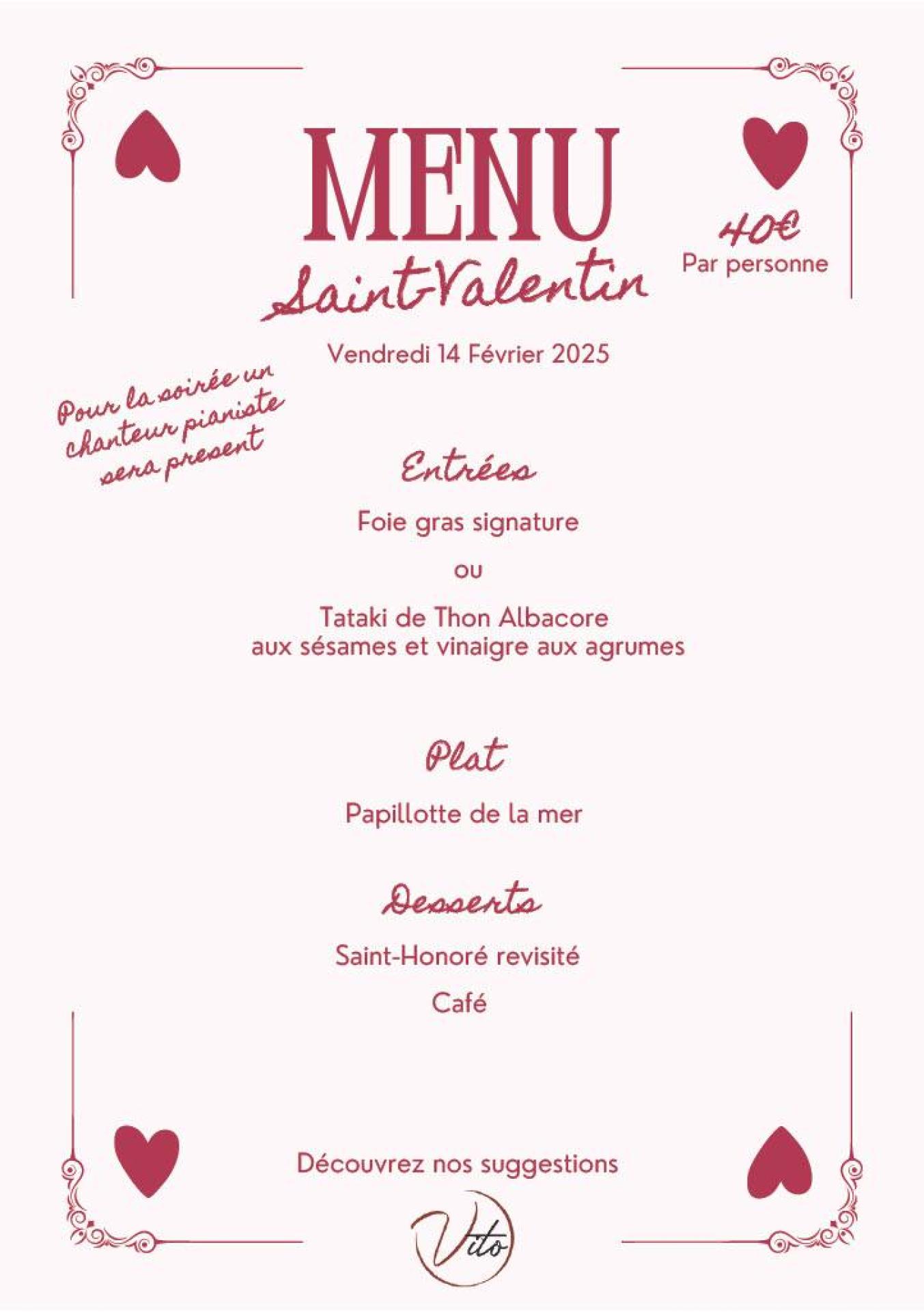 Pour accompagner ce menu spécial Saint-Valentin 2025, à 40 euros par personne, votre restaurant Vito vous propose en dessert, un Saint-Honoré revisité à l’italienne. Une interprétation orchestrée par notre chef pour parfaire la soirée de tous les amoureux qui seront présents le 14 février prochain dans notre établissement à Pernes-les-Fontaines. Pour accompagner votre dîner, une sélection de vins italiens soigneusement choisis est également proposée. Réservez dès maintenant pour une soirée spéciale pour tous ceux qui viennent de se rencontrer et tous ceux qui ont plein de souvenirs à partager, et de nouveaux à créer.